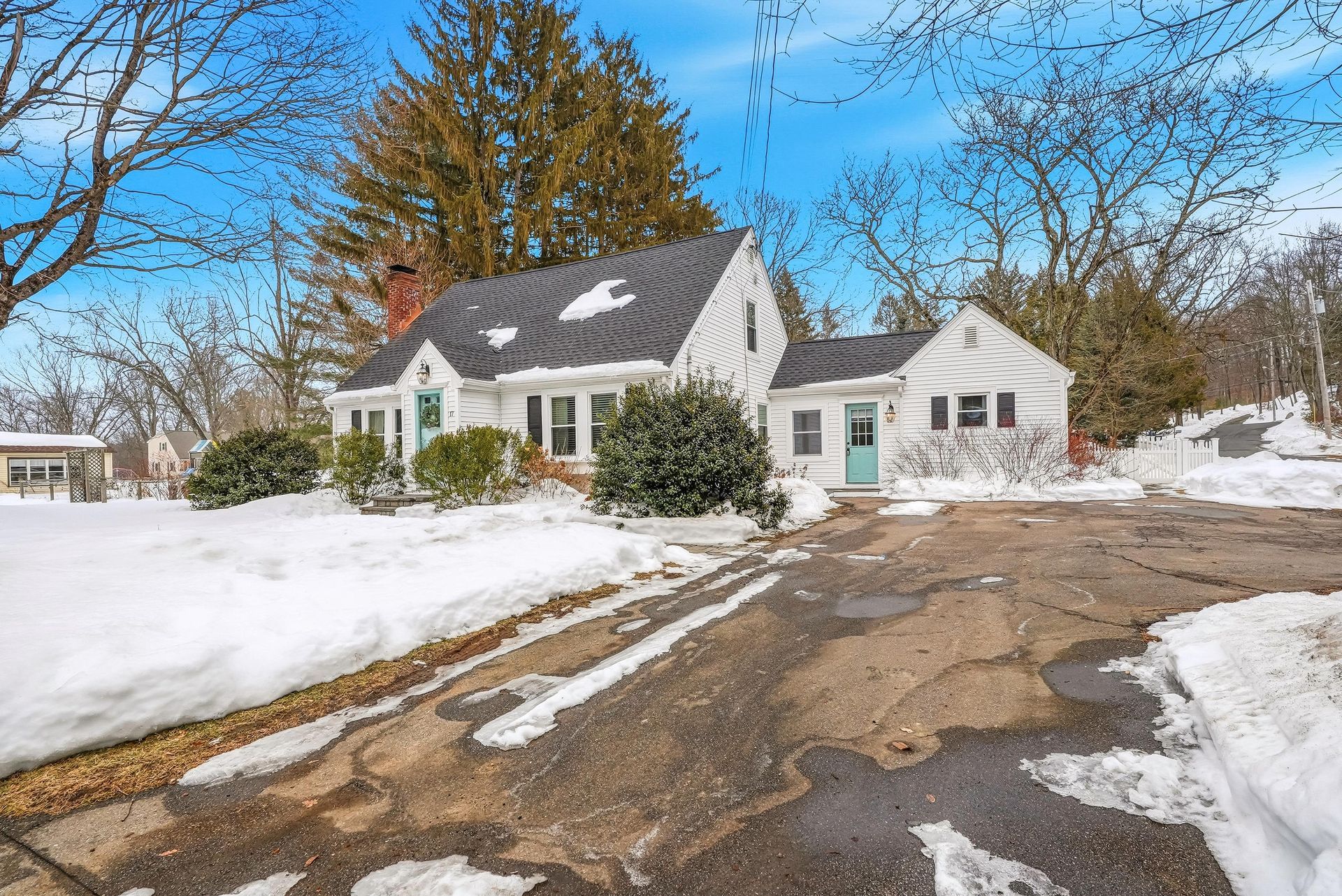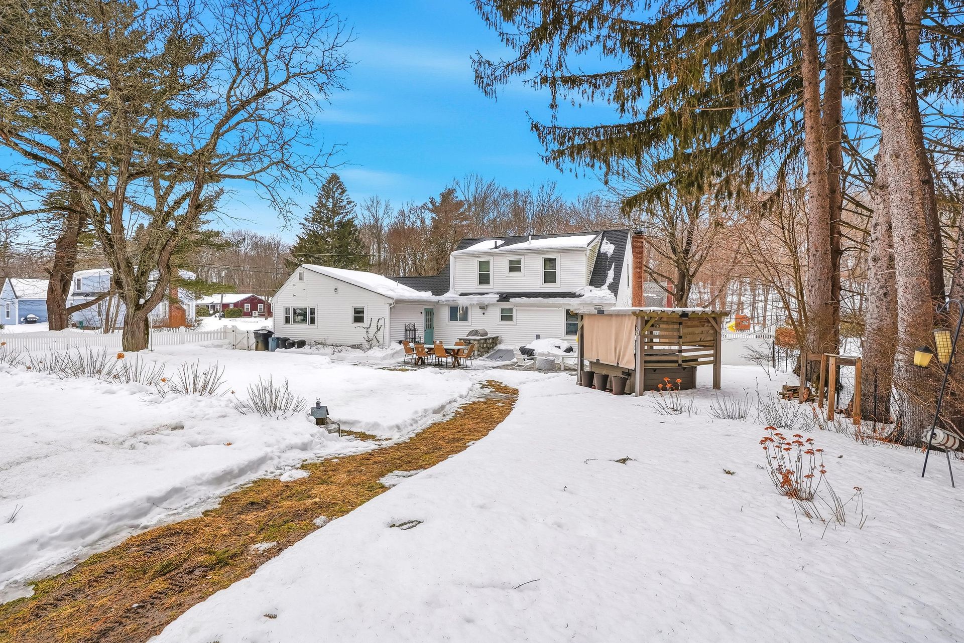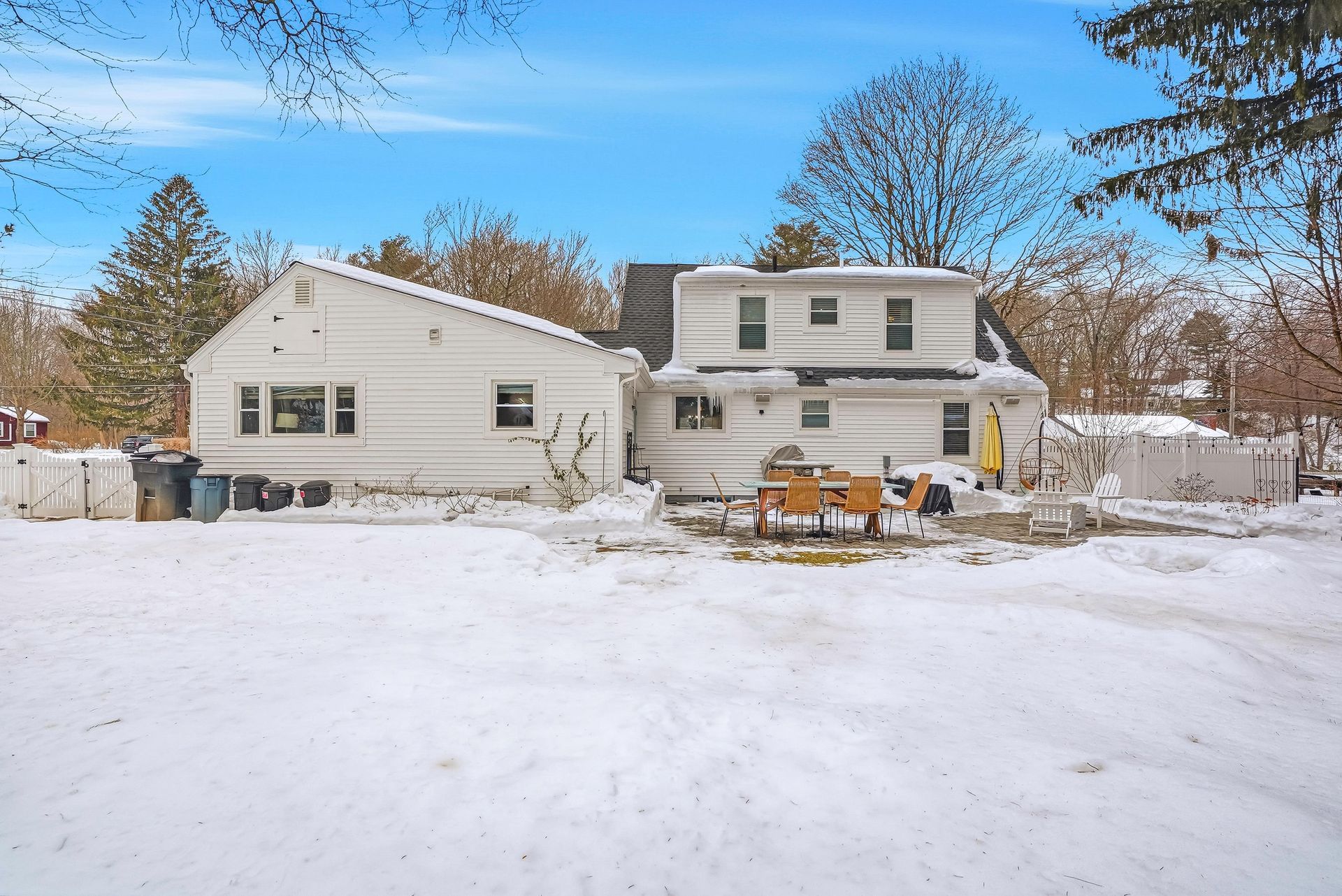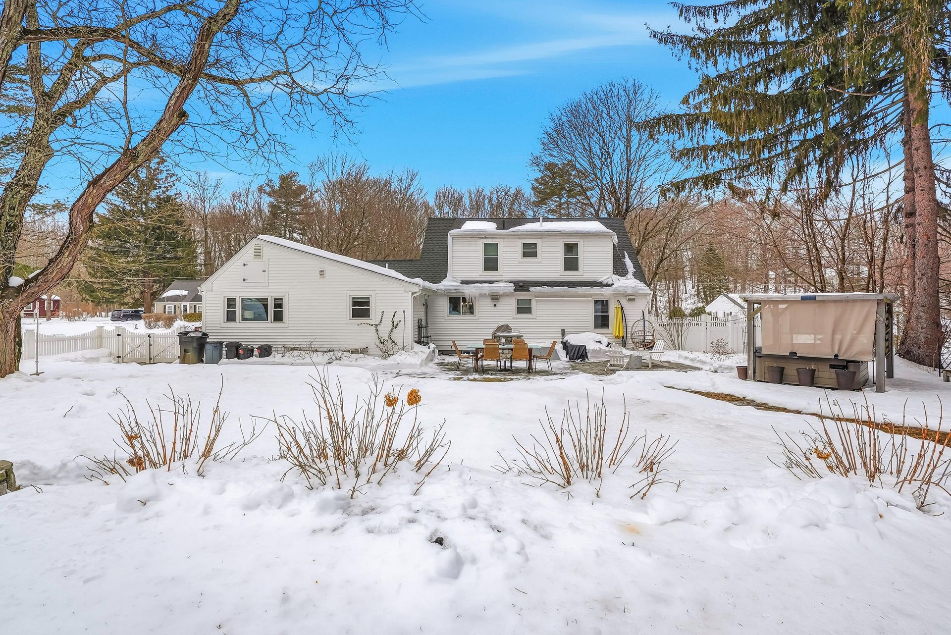 Discover this rare offering, a welcoming single-family residence featuring an integrated additional living space. This unique property is a standout for those seeking a guest suite, multi-generational setup, or the ultimate home office. The main home features an updated kitchen opening to a formal dining room with pantry and a cozy living room with a pellet stove. A versatile den/bedroom and full bath complete the main level. Upstairs, find the primary suite with built-ins, a walk-in closet, another bedroom, and updated bath. Comfort is guaranteed with CA, a brand-new roof, and a finished basement. The two living spaces are connected by a spacious mudroom, though the suite maintains privacy with its own entrance, dedicated electric meter, and separate water heater. Outside, enjoy a level, fenced-in oasis with 60K in upgrades featuring a stone patio, alfresco kitchen with Coyote grill/smoker, hot tub, plus an EV charger! Located on a corner lot near major routes and conservation land.