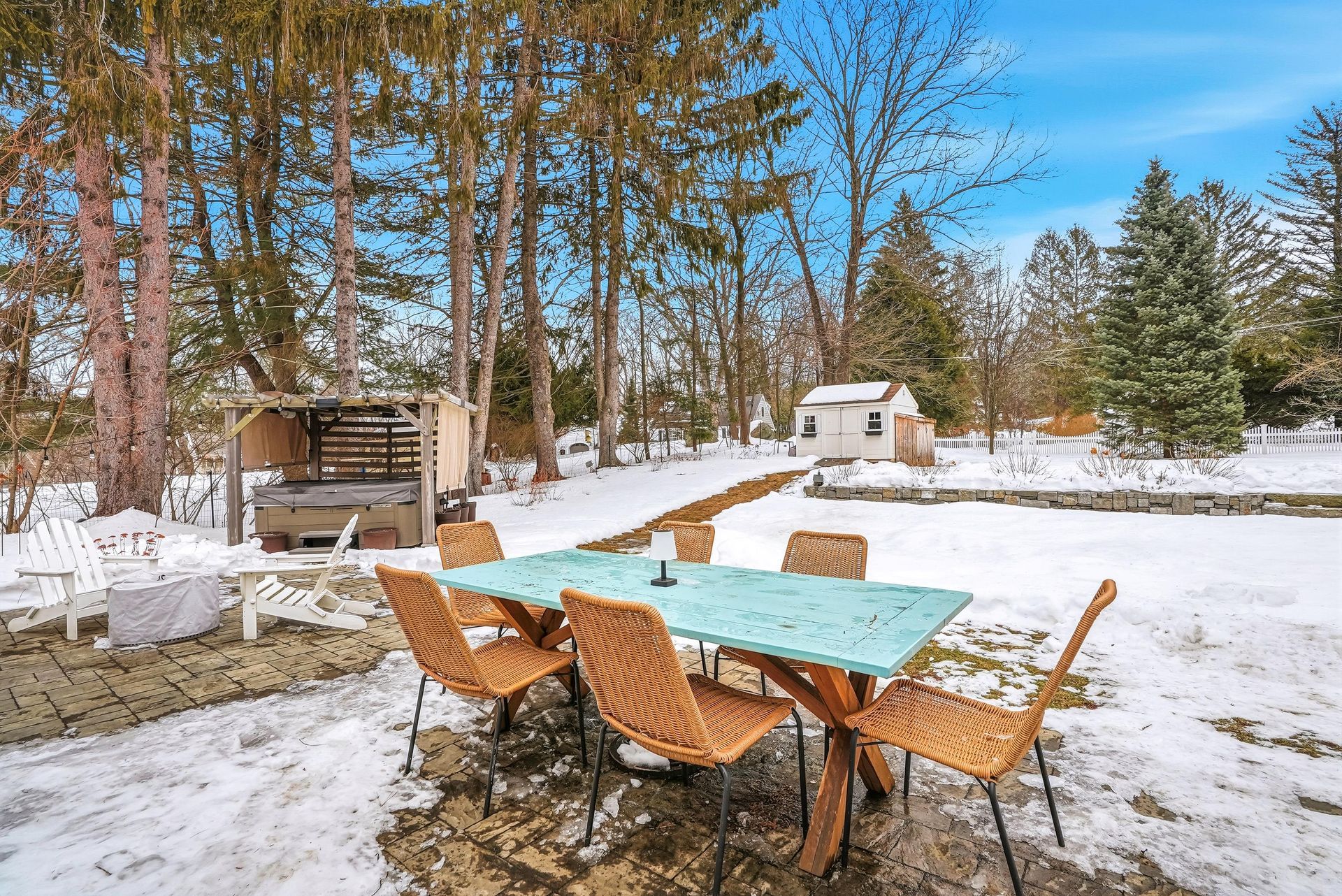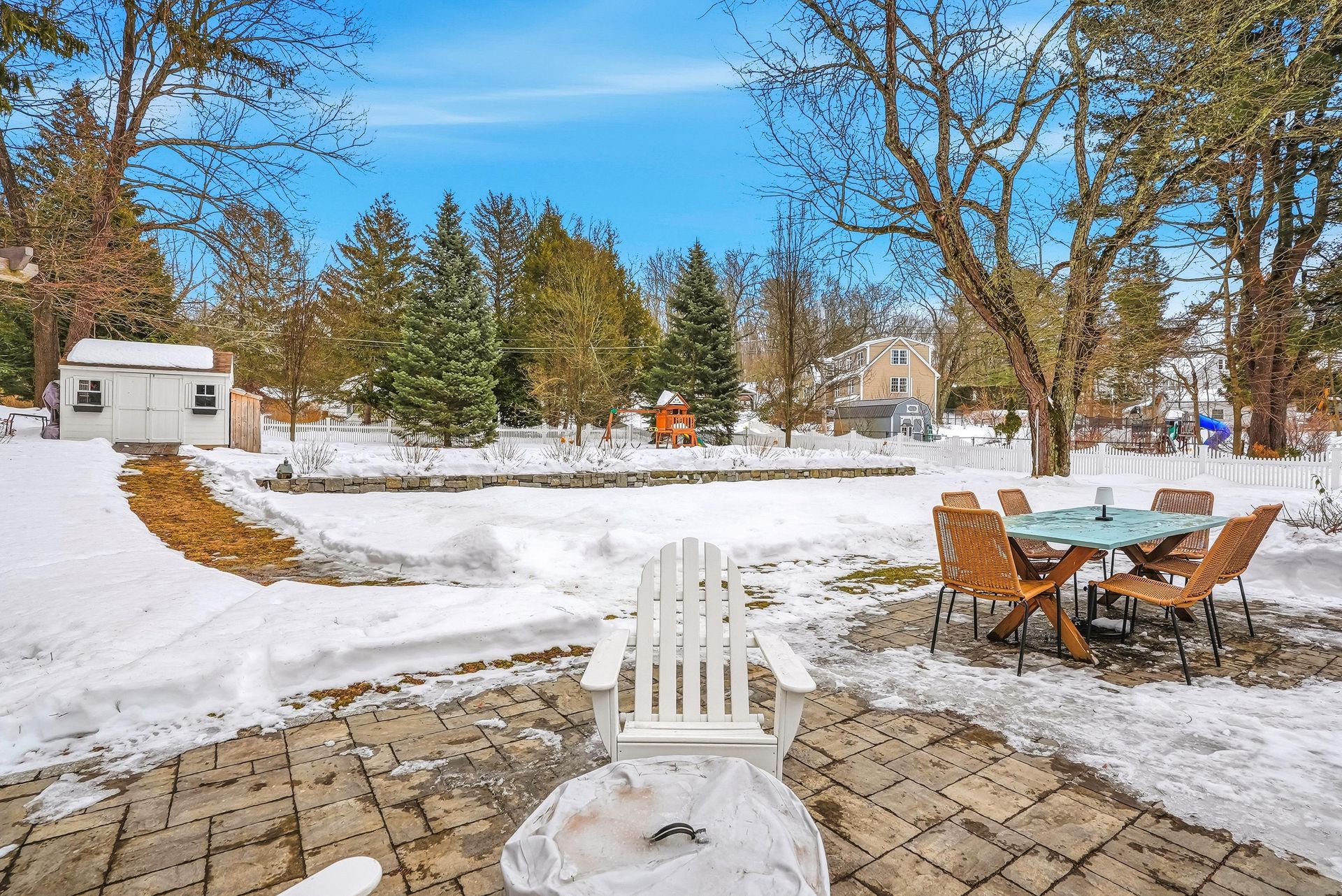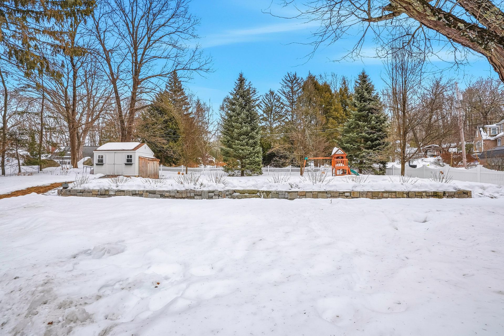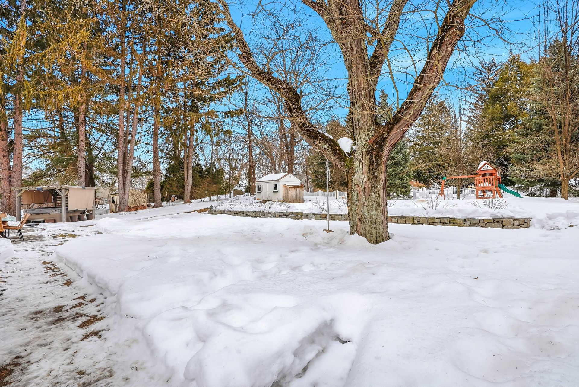 - Stone patio, stone walls, garden, shed